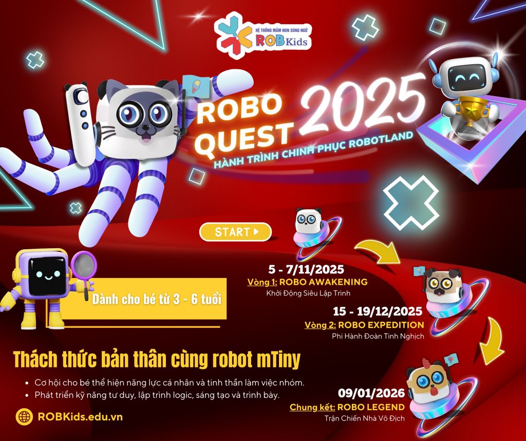 Hệ thống Trường Mầm non Song ngữ ROB Kids chính thức công bố sự kiện công nghệ được mong chờ nhất năm: CUỘC THI ROBO QUEST 2025 với chủ đề đầy cuốn hút: “HÀNH TRÌNH CHINH PHỤC ROBOTLAND”!